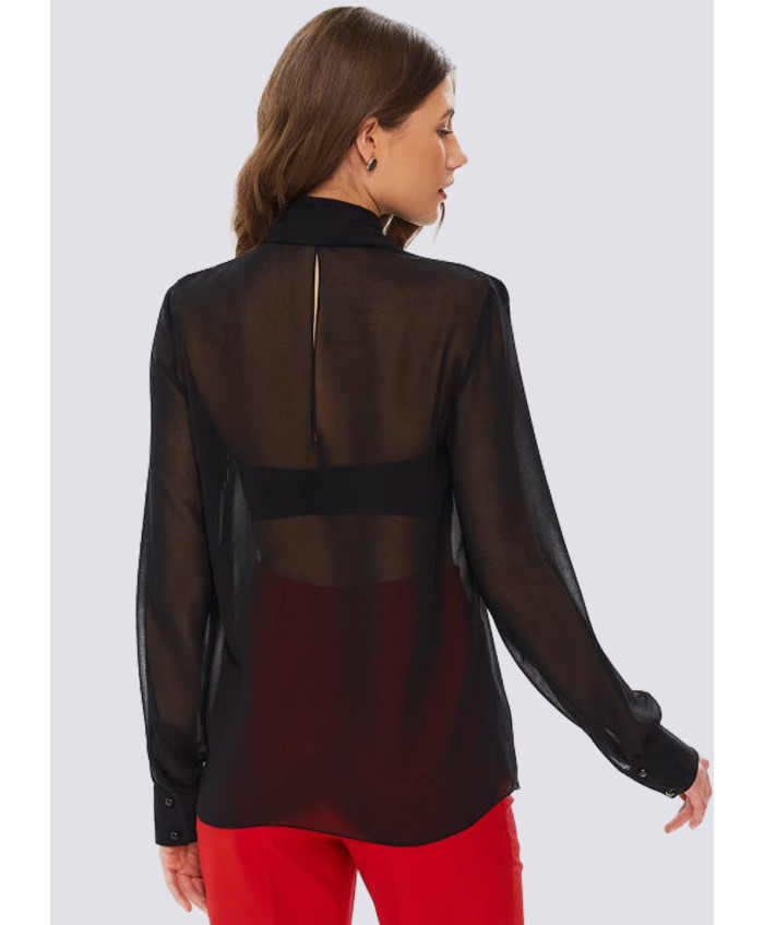 Жіноча блузка виготовлена з прозорого шифону. Комір виконаний у вигляді широкої стрічки. Ви можете зав'язувати декоративний комір бантом або вузл..