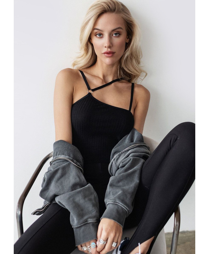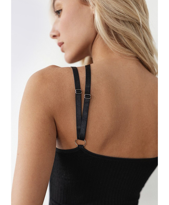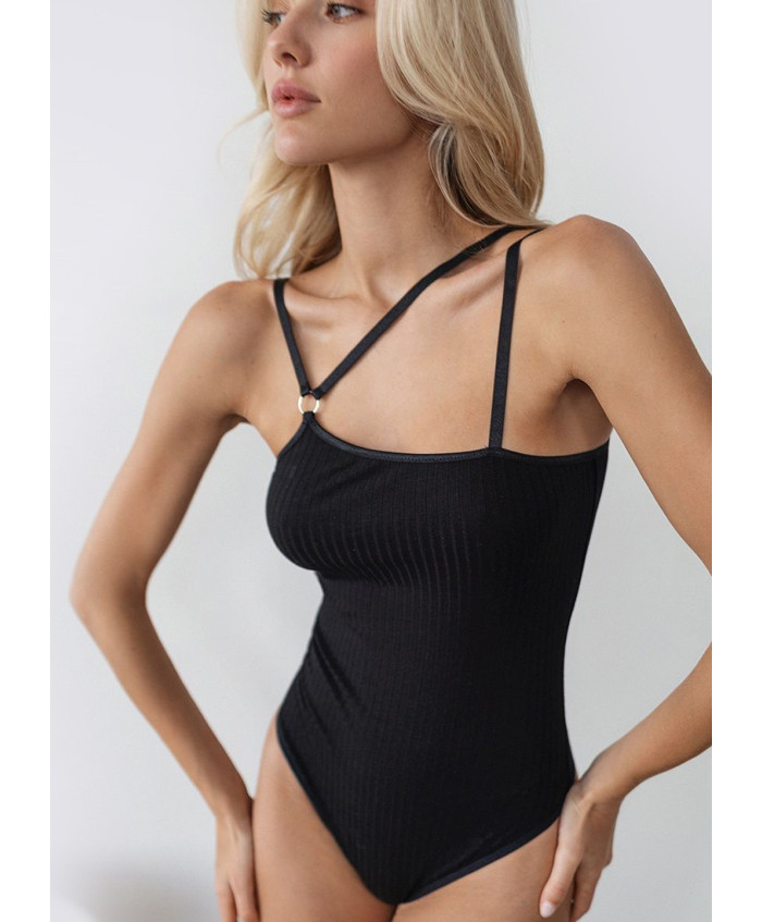 Жіночий боді на тонких бретелях асиметричного крою. Виконаний з м'якої тканини у рубчик. Виріз трусиків - стрінги. Застібка гачки. ВиробництвоУк..