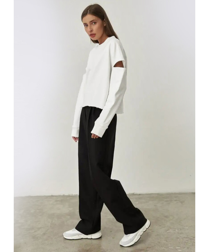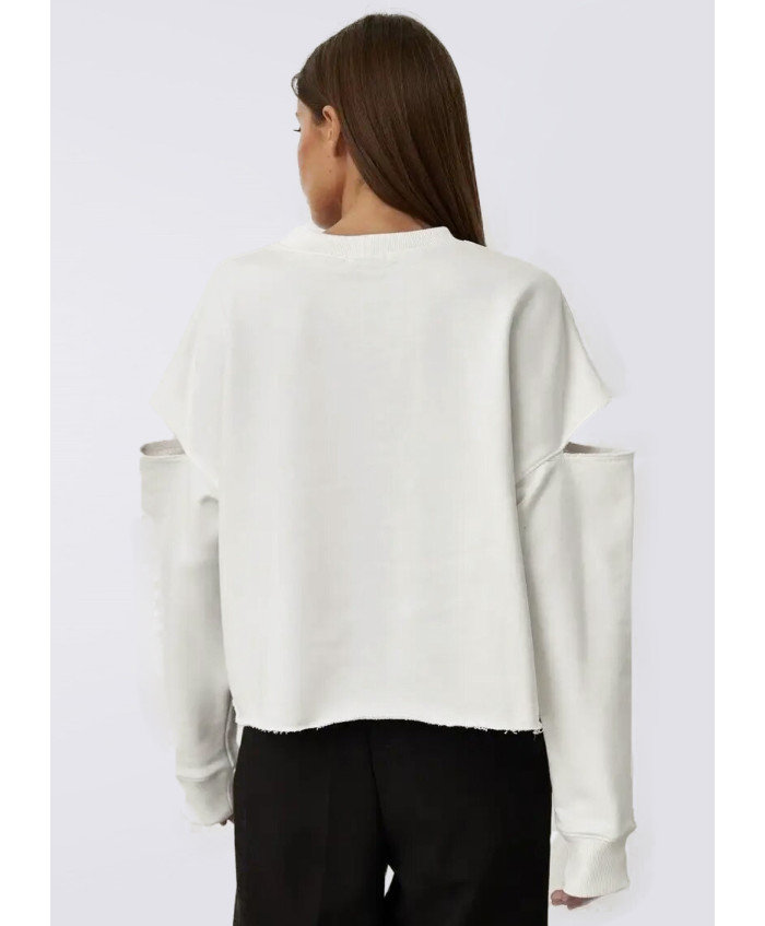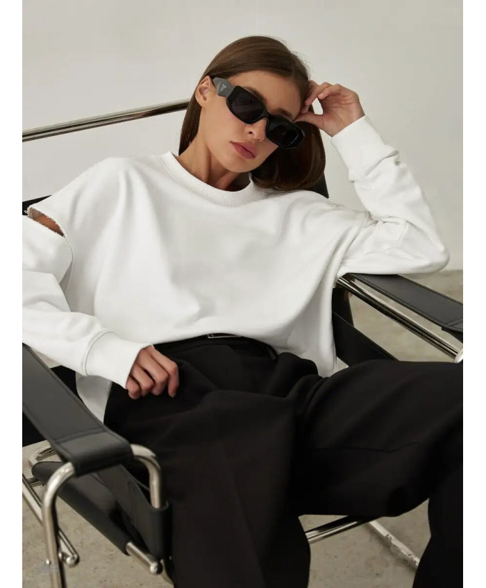 Жіночий світшот виконаний з трикотажу - футер двонитка, без начісу з виворітного боку. Силует оверсайз, прямий. Лінія плеча опущена, декоративні розрі..