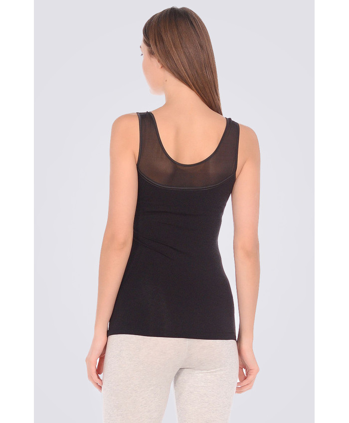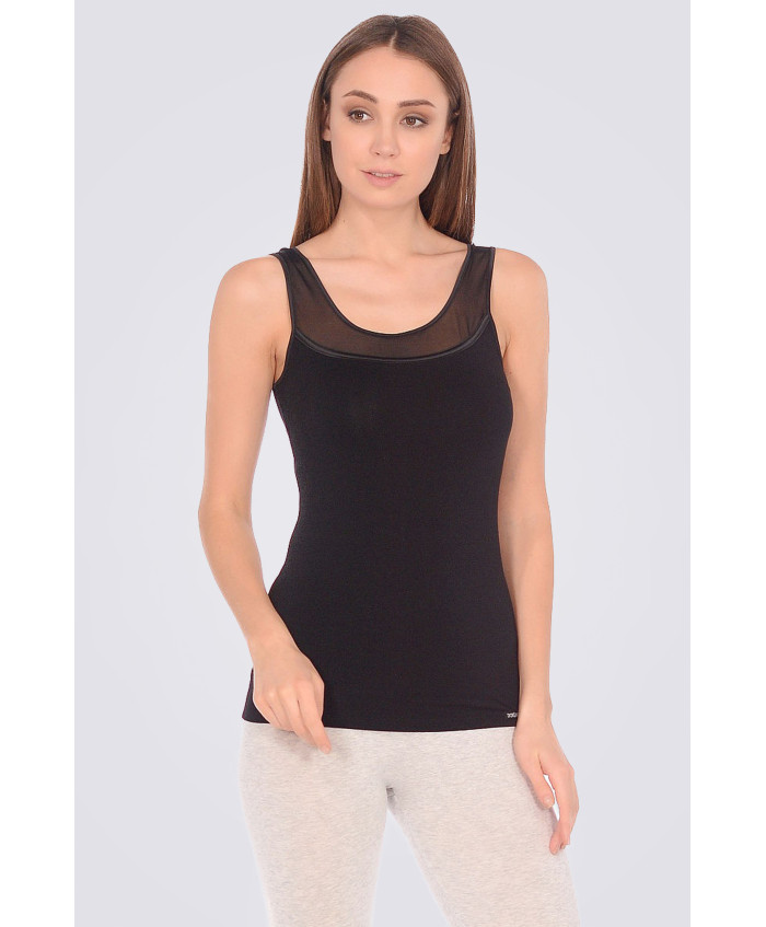 Жіноча майка Doreanse без рукавів. Виріз горловини - човник, напівпрозора вставка сіточкою прикрашає декольте і верхню частину спинки. Актуальний модал в складі тканини робить виріб комфортним, приємним в носці, гігроскопічним.
