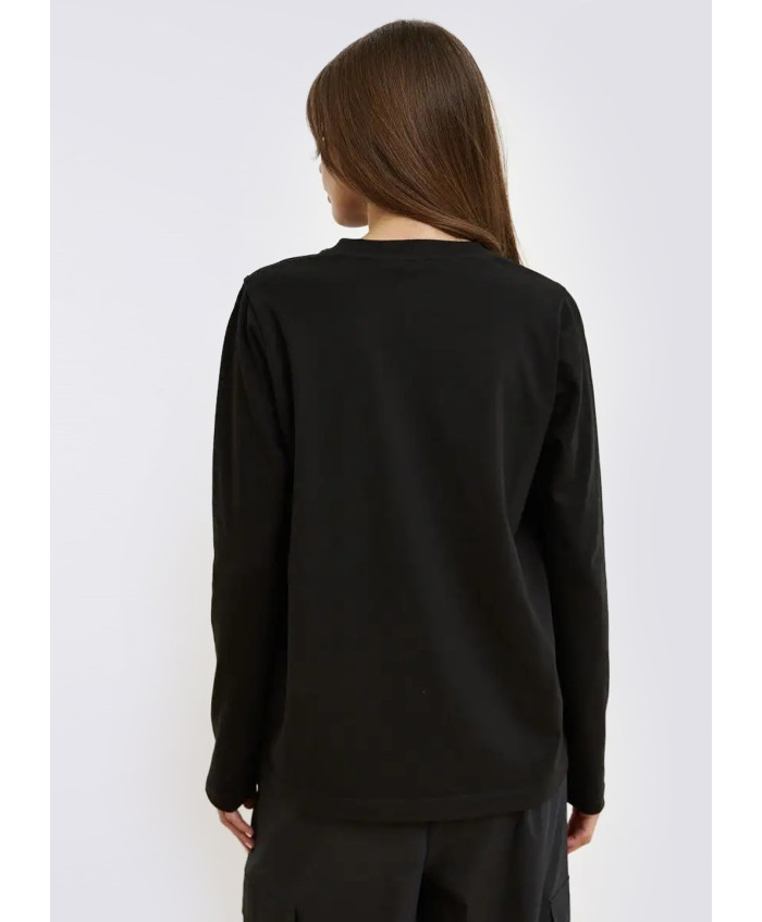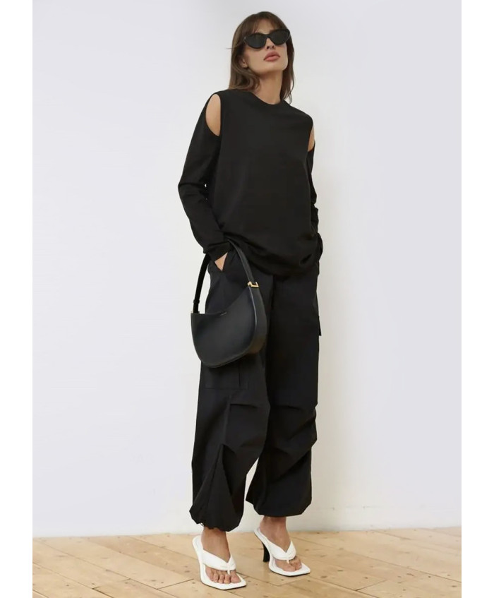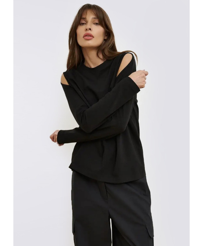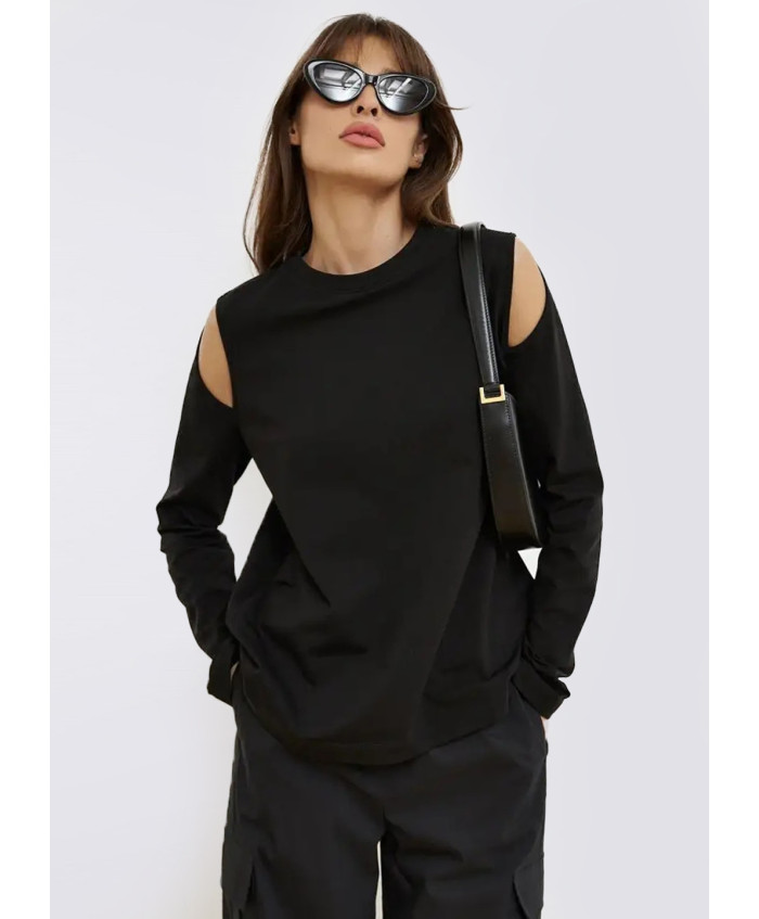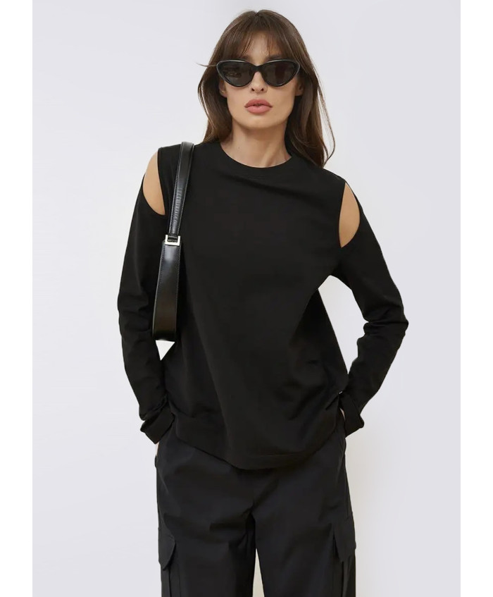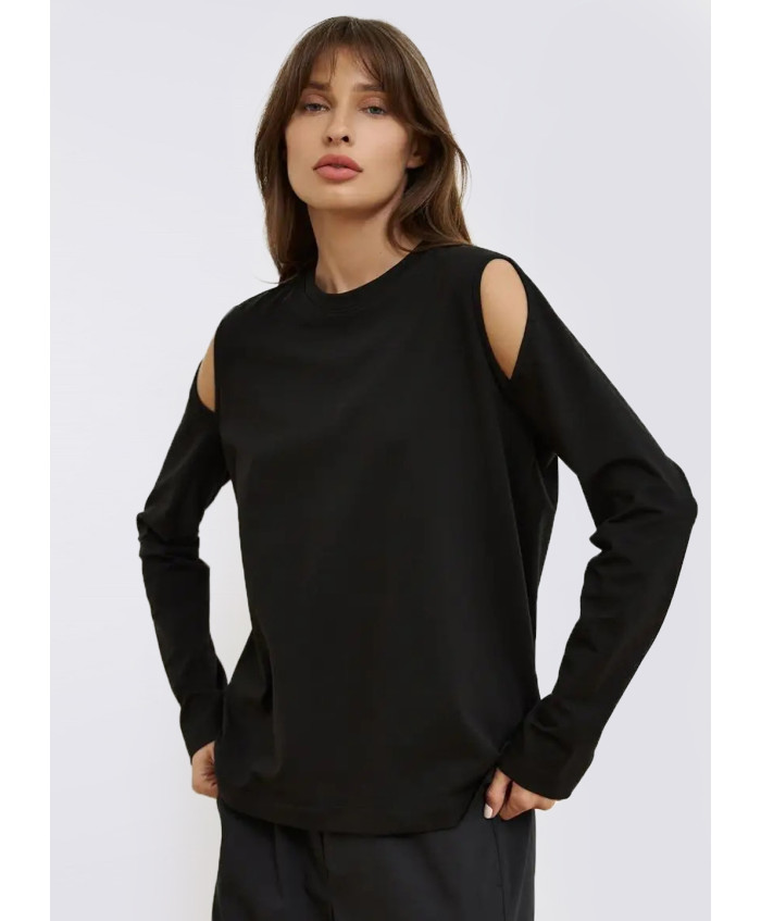Жіночий лонгслів виконаний із бавовняного трикотажу. Силует оверсайз. Декоративні вирізи на плечах.
