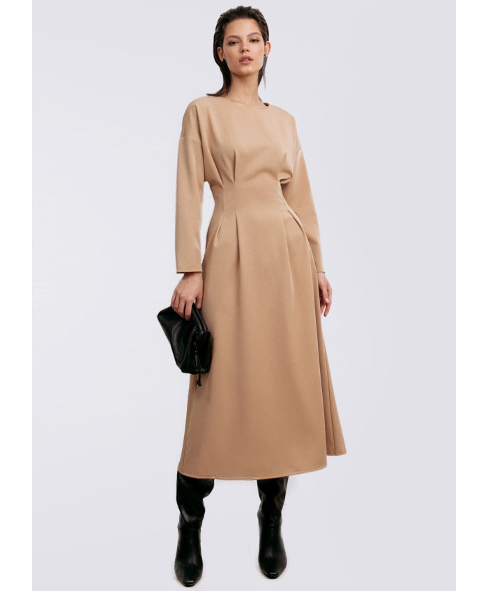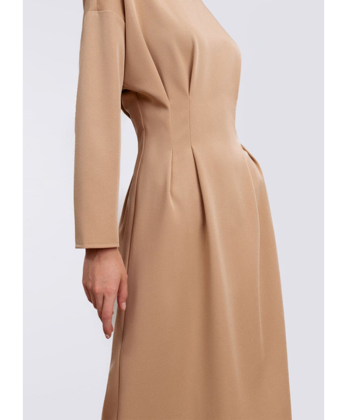 Жіноче плаття вільного силуэта із защипами, які підчеркивают талію. Линия плеча спущена, рукав довгий.