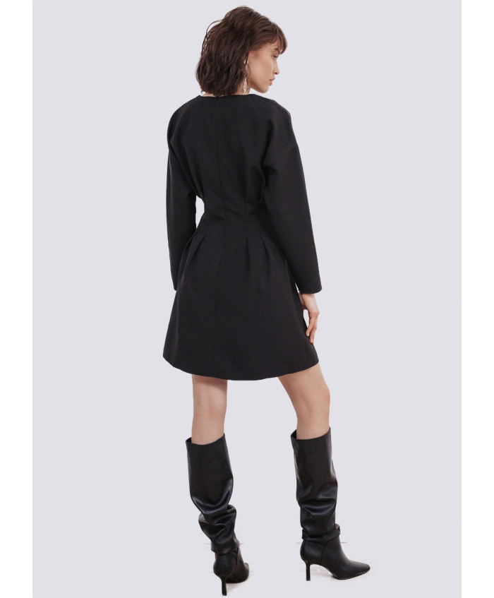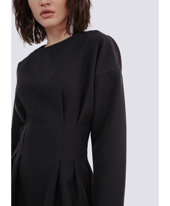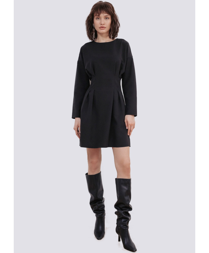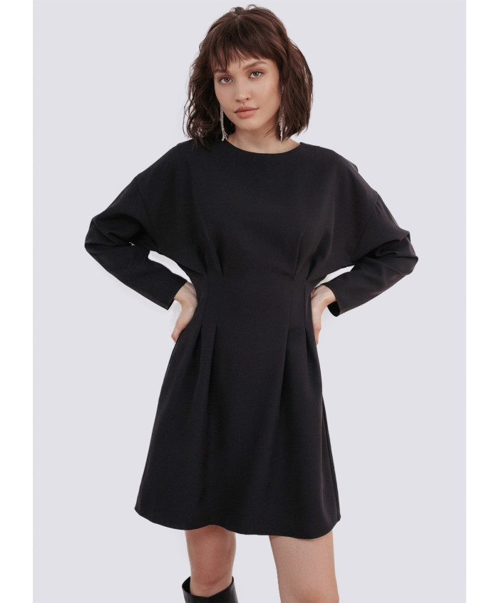 Жіноче плаття вільного силуэта із защипами, які підчеркивают талію. Линия плеча спущена, рукав довгий.