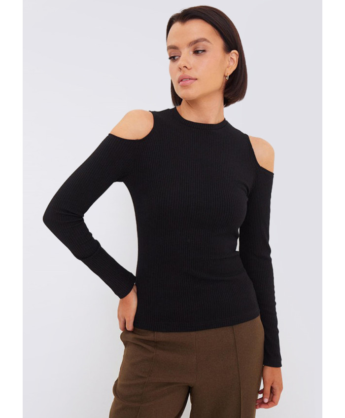 Жіноча гольф з невисоким комірцем, виконаний з віскозного трикотажу в рубчик. Силует приталений по фігурі. Має вирізи на плечах.