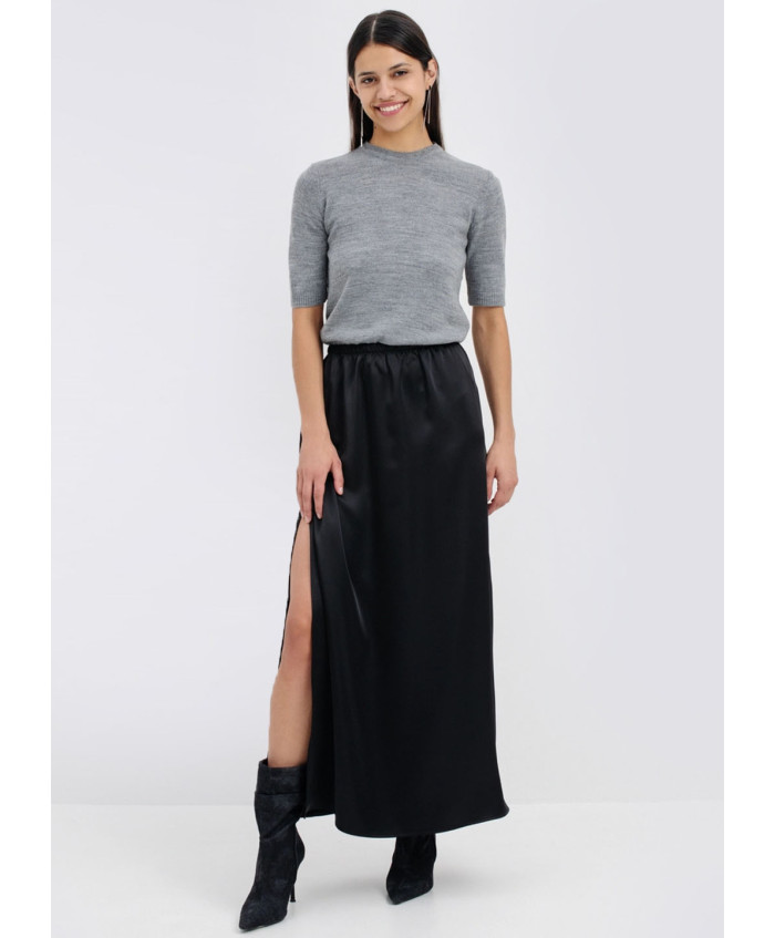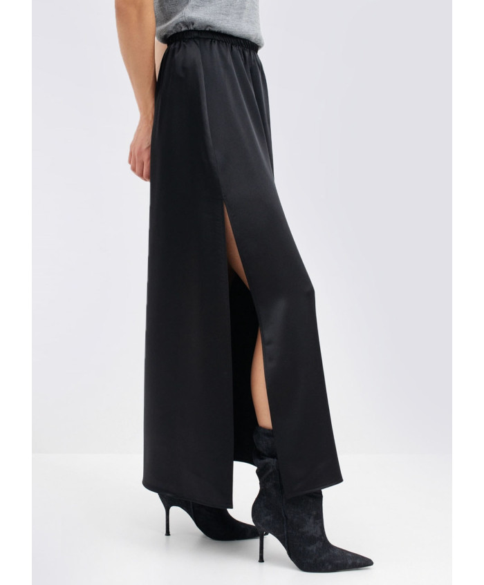 Жіноча спідниця виконана з тонкого та легкого штучного шовку. Пояс на резинці. Розріз.
