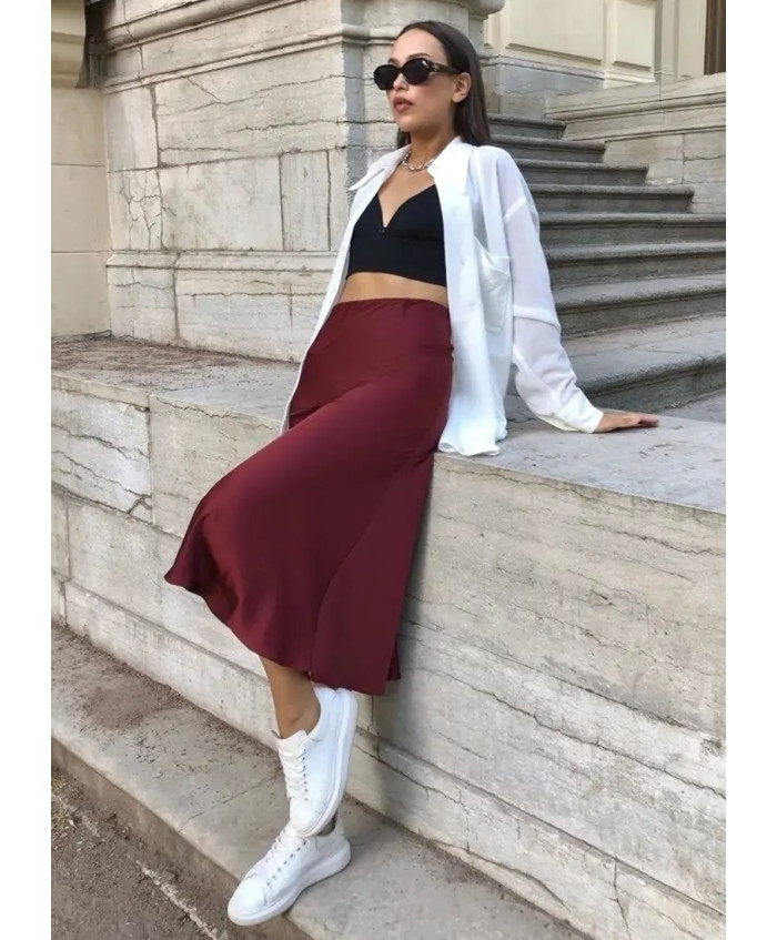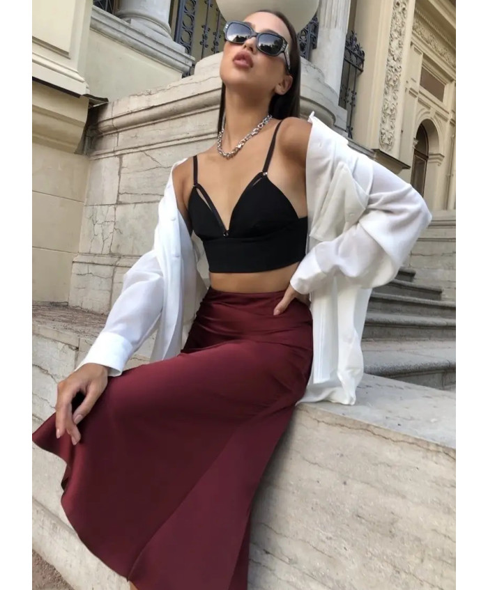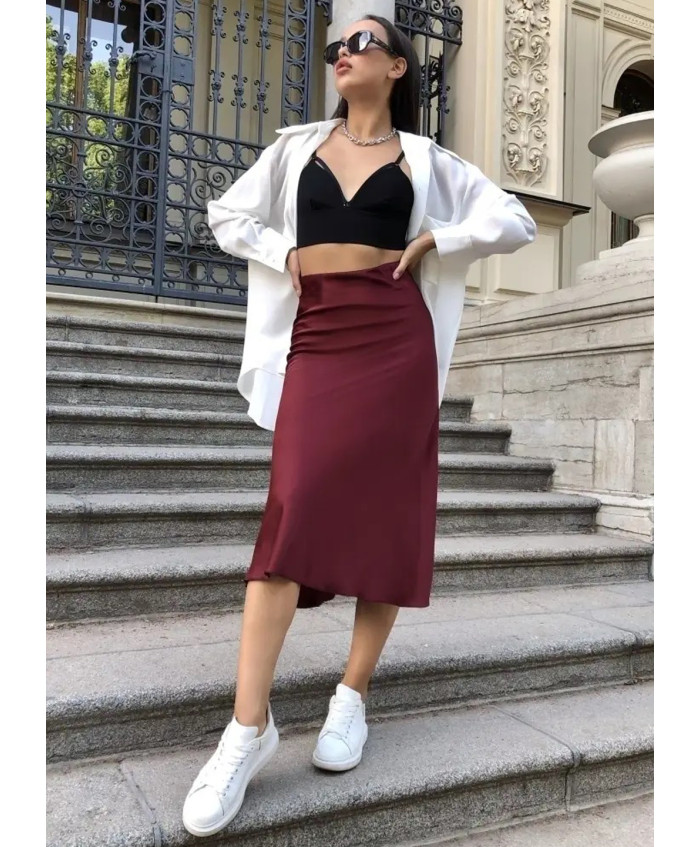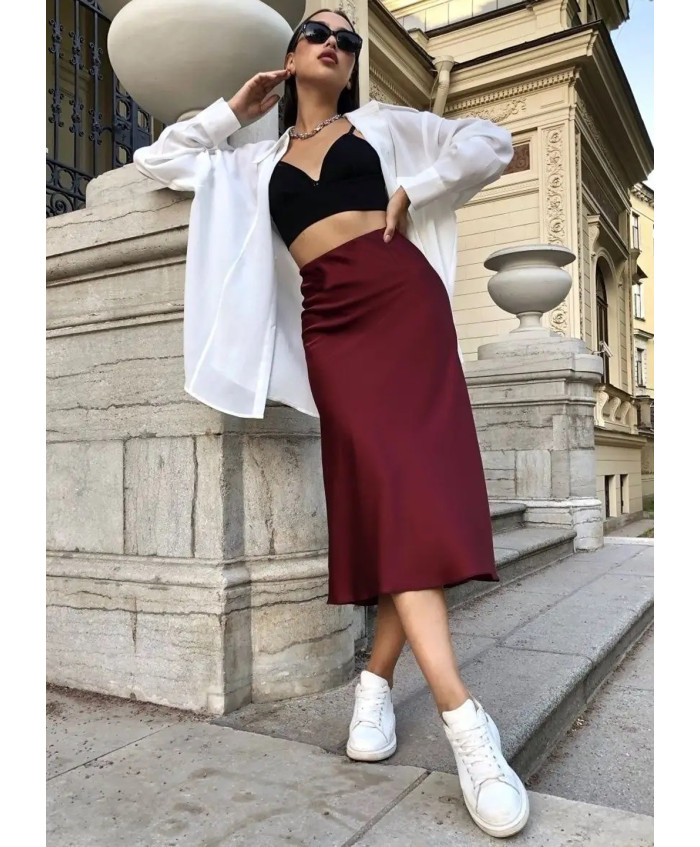 Спідниця із завищеною талією у білизняному стилі виконана зі штучного шовку.