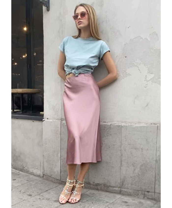 Спідниця із завищеною талією у білизняному стилі виконана зі штучного шовку.