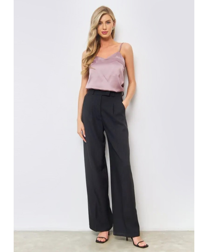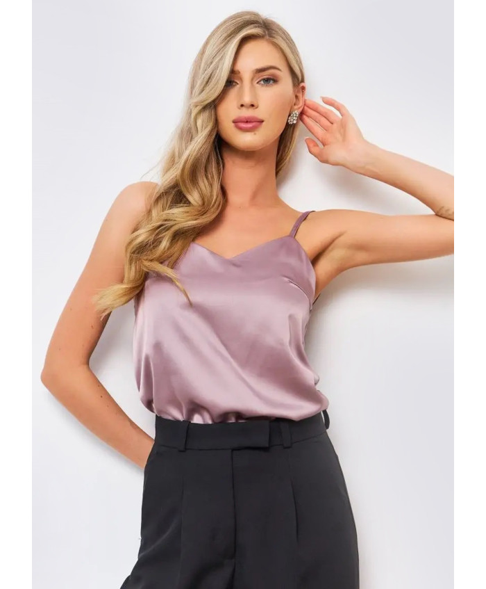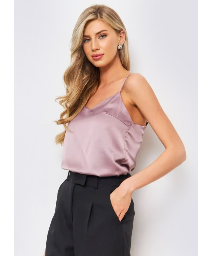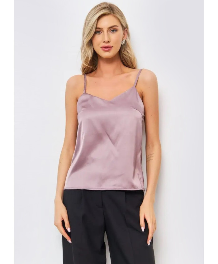 Топ у білизняному стилі зі штучного шовку. Силует рівний, злегка приталений, плавний V-подібний виріз. Регульовані тонкі бретелі. Довжина шовкової май..