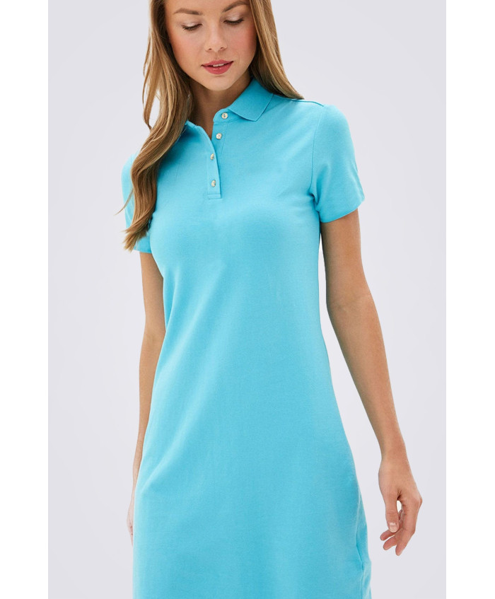Сукня поло вільного злегка приталеного силуету. Виконано з тканини Лакоста з характерним для теніс поло плетінням.