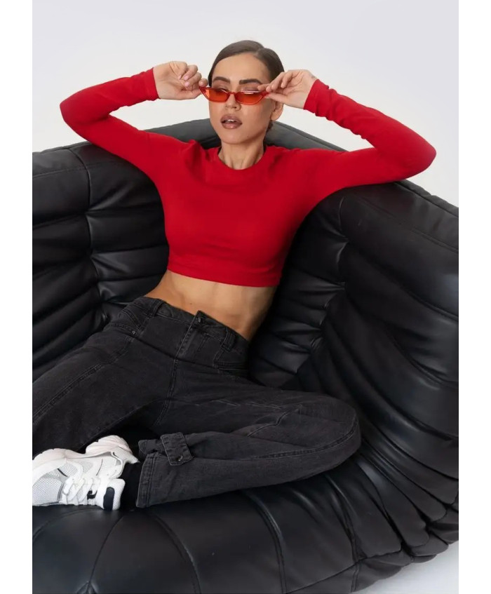 Вкорочений трикотажний топ з довгим рукавом та комірцем стійкою.