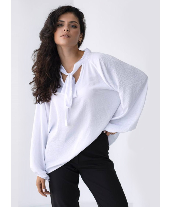 Жіноча блуза з легкої жатої тканини. Силует широкий, дуже вільний. Комір - зав'язка.One size:Напівобхват виробу по грудях 70 см.Довжина виробу 66 см.P..