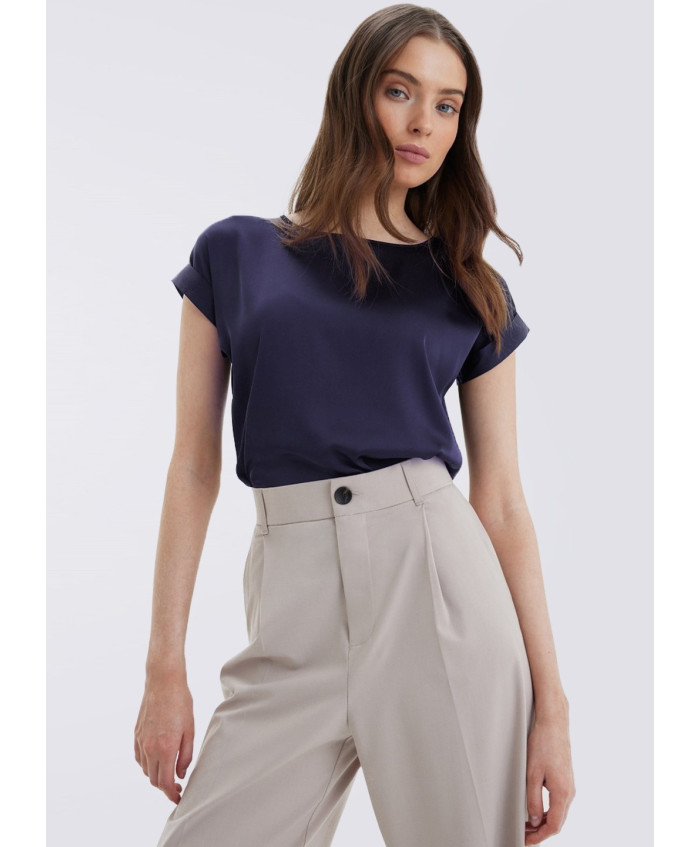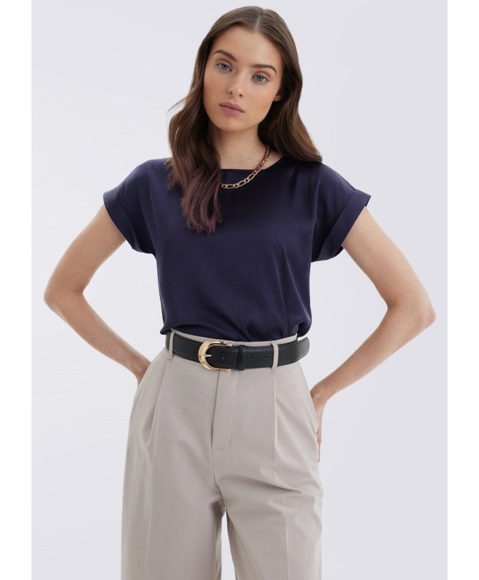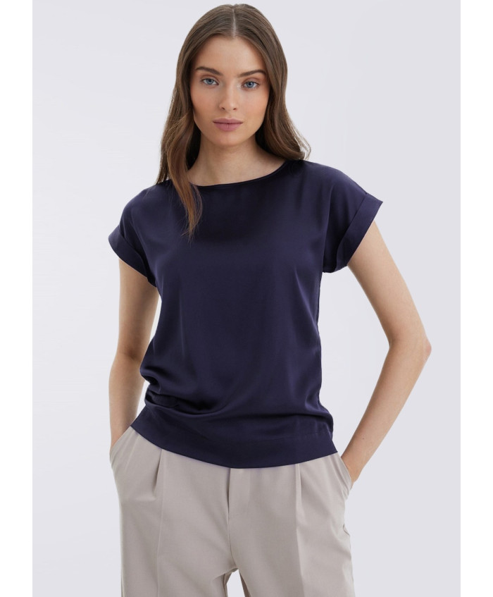 Шовкова блузка темно-синього кольору. Крій блузи вільний - туніка, круглий виріз, лінія плеча спущена, обробка широким манжетом.
