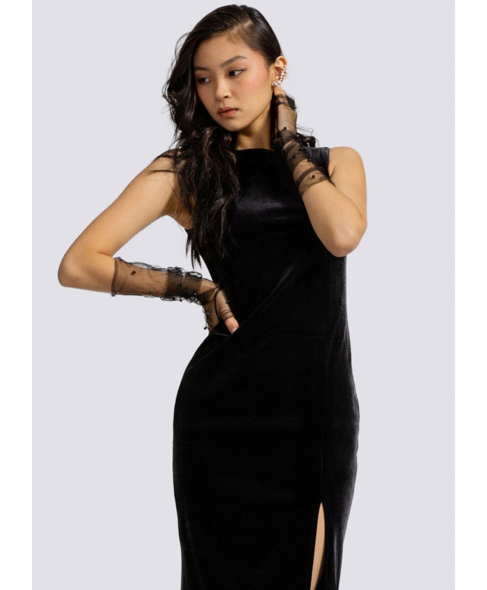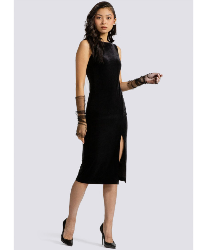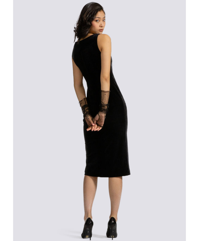 Сукня футляр із оксамиту високої якості. Тканина має матовий блиск, добре тягнеться. Силует сукні облягає.